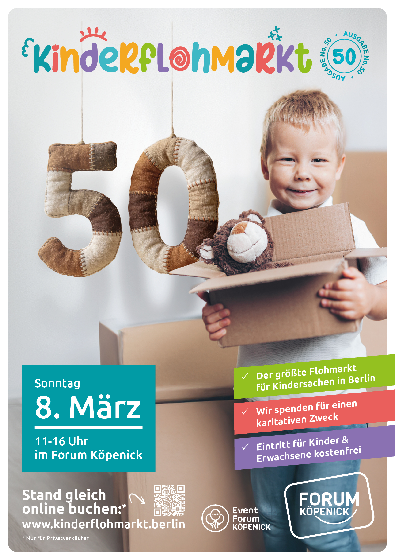 Beim 50.Kinderflohmarkt Berlin am Sonntag, den 08.03.2026 ist von Spielzeug über Kindermode bis hin zu besonderen Schätzen aus dem Babyflohmarkt Bereich für jeden etwas dabei!